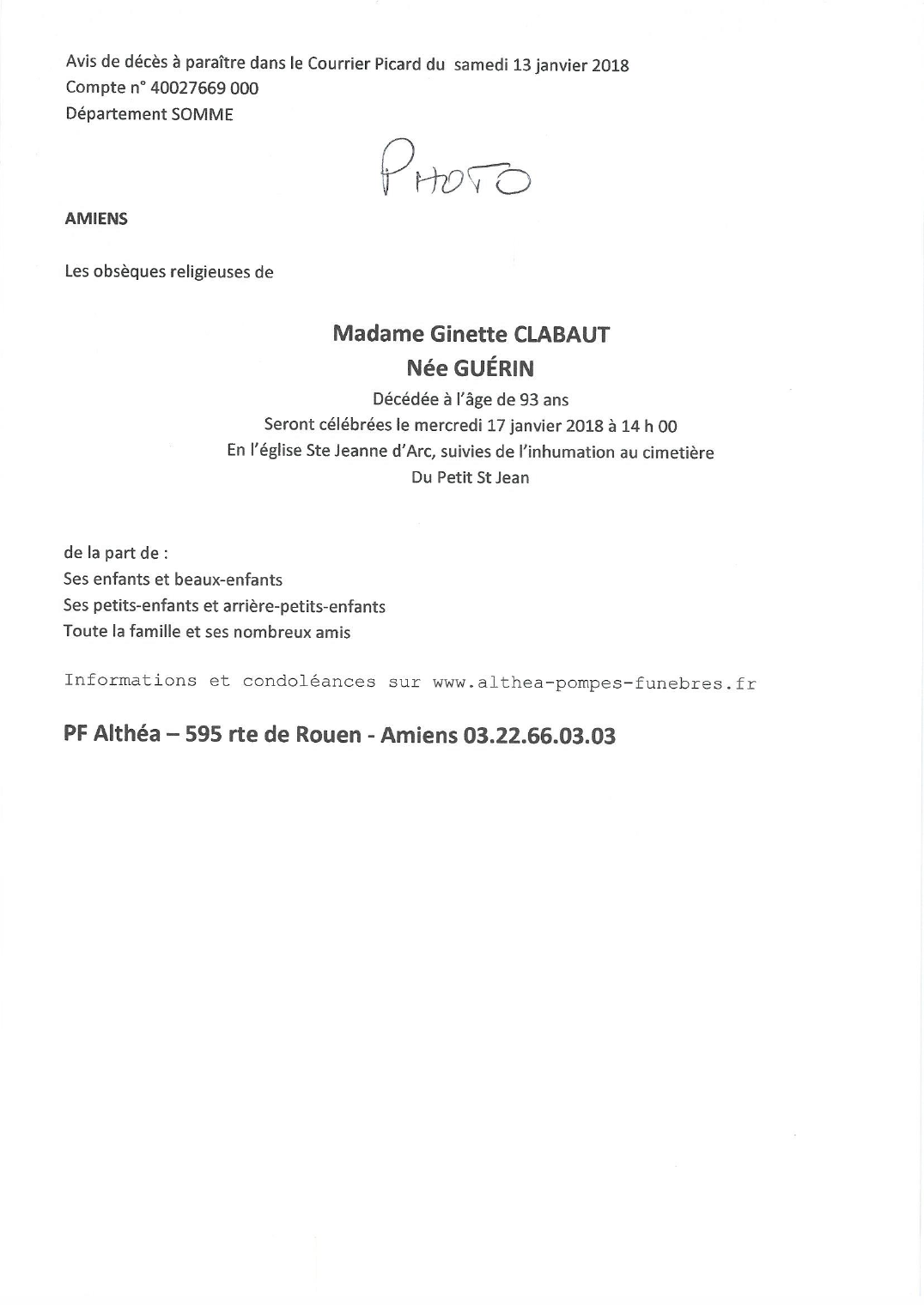 Décédée à Amiens (80000, France) le mercredi 10 janvier 2018 à l'âge de 93 ans