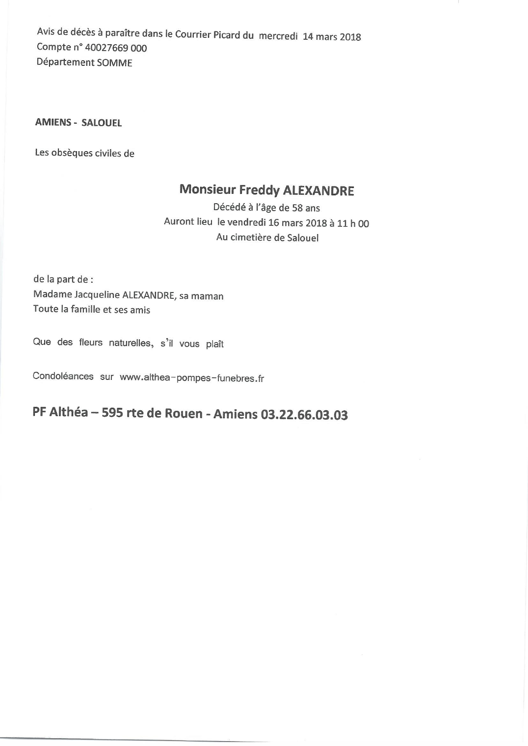 Décédé à Amiens (80000, France) le jeudi 8 mars 2018 à l'âge de 58 ans